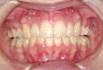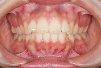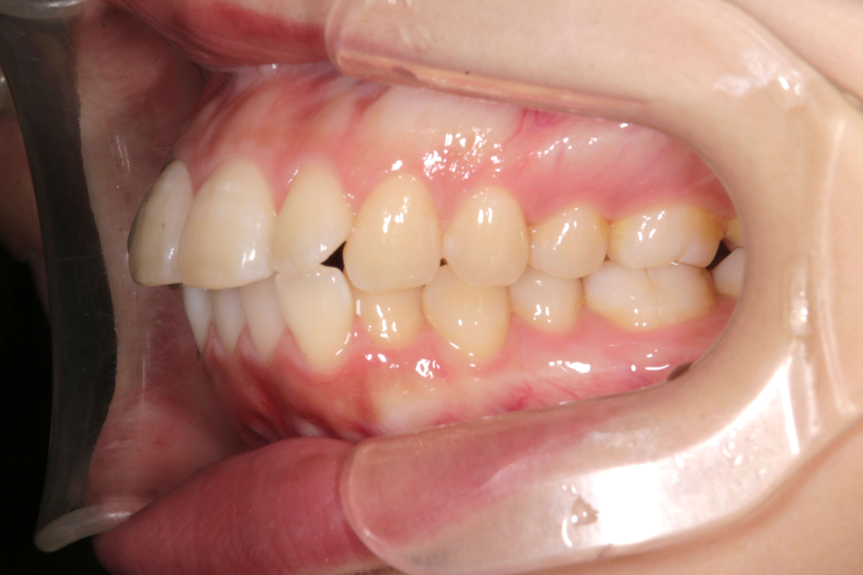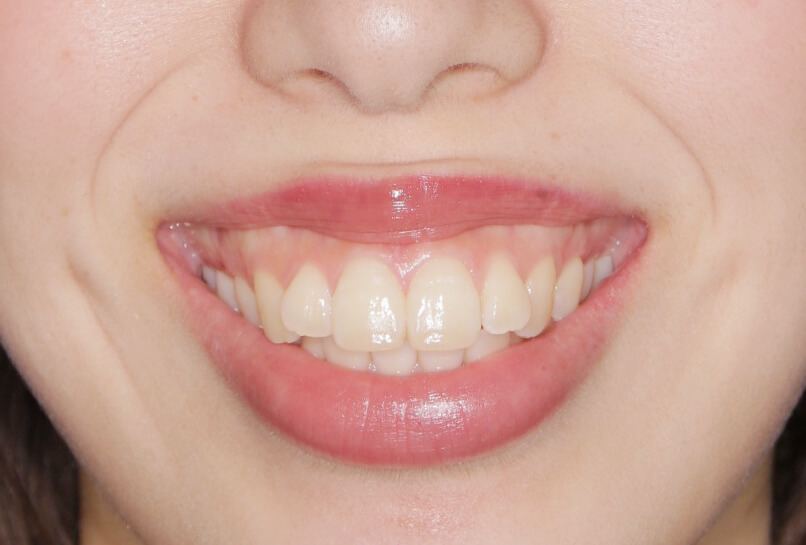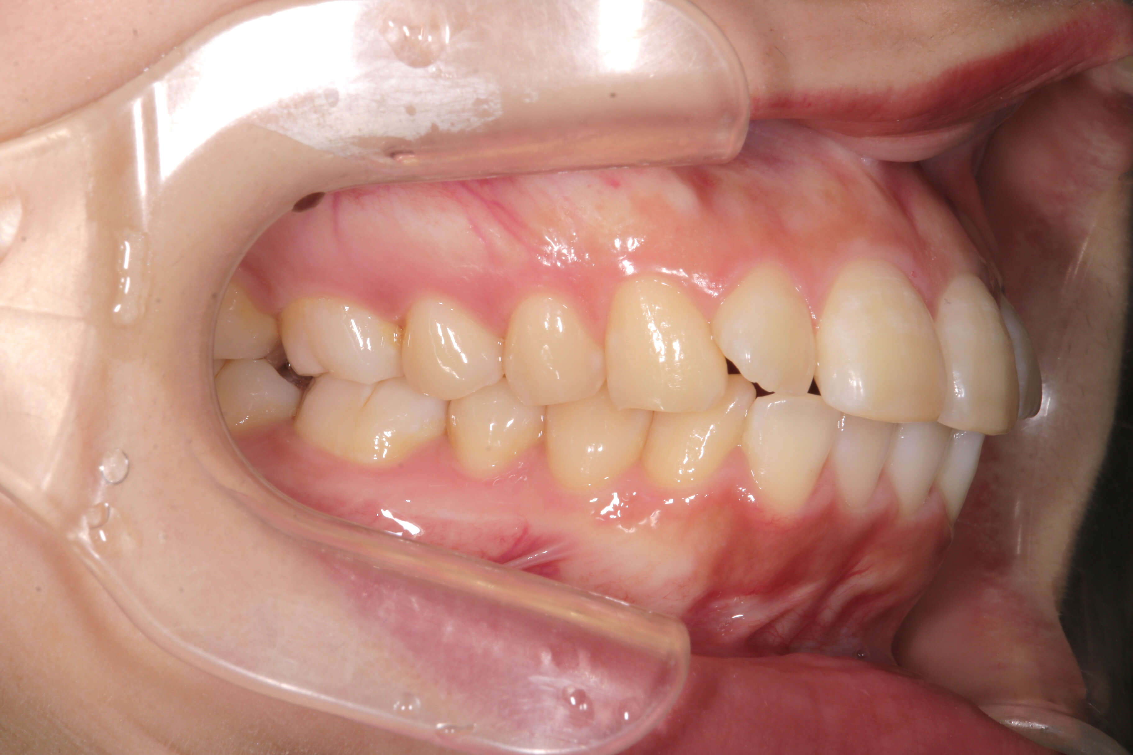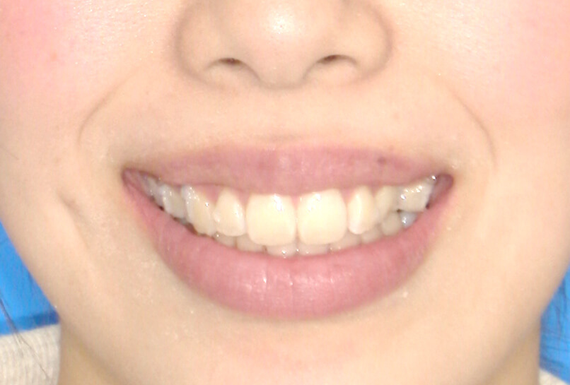 長期に地元を離れる予定もあり、効率よく治療したいとのご希望。臼歯の移動を確実に行うため初めの11ヶ月のみ下顎に唇側ブラケット装置を併用、ガミースマイルも改善しました。その後来院できない期間にインビザランで治療を継続しました。